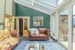 The ground floor is approached via a rear hallway with slate-tiled flooring and a mat well, leading into a practical utility space, shower room with WC, boiler room, general-purpose store, and a shelved larder. A conservatory/garden room opens directly onto the rear gardens via twin-leaf doors, offering a tranquil retreat.
