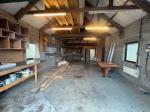 Large white painted harled-finish workshop/garage and general-purpose kit and equipment stores under a corrugated sheet roof, inspection pit, light power and water, WC and wet room-type shower.