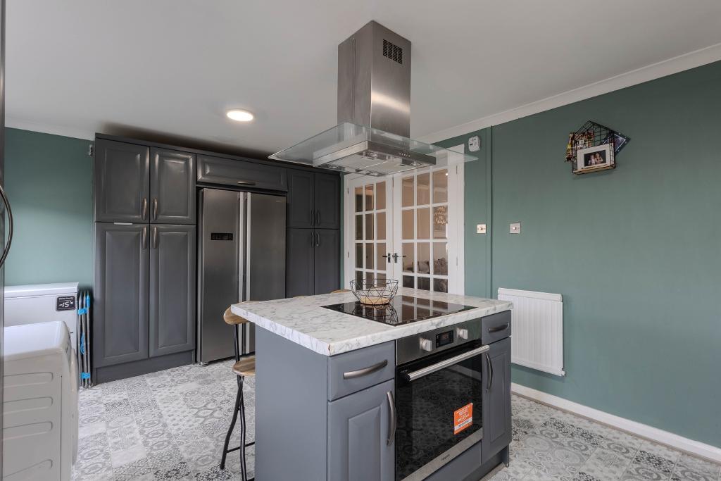 To the rear, the home opens into a well-appointed and expansive kitchen/dining area, fitted with a range of units and offering ample space for family dining. The adjoining family room, formed as part of the side extension, is a superbly versatile space with French doors leading directly to the rear garden. This room lends itself to a variety of uses, including a second sitting room, playroom, or home office.