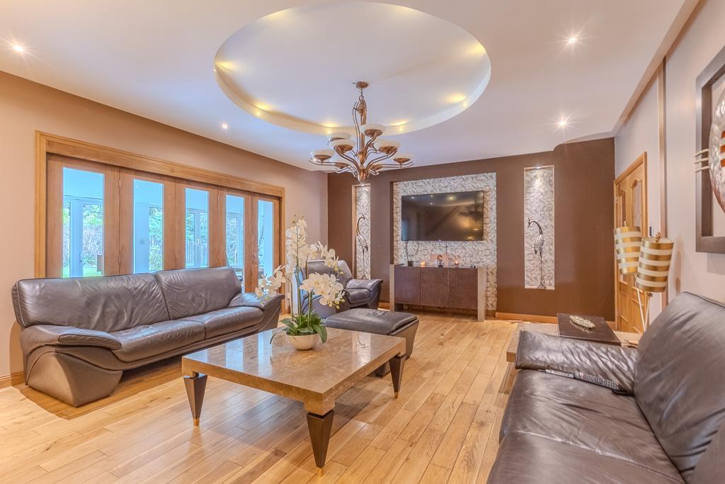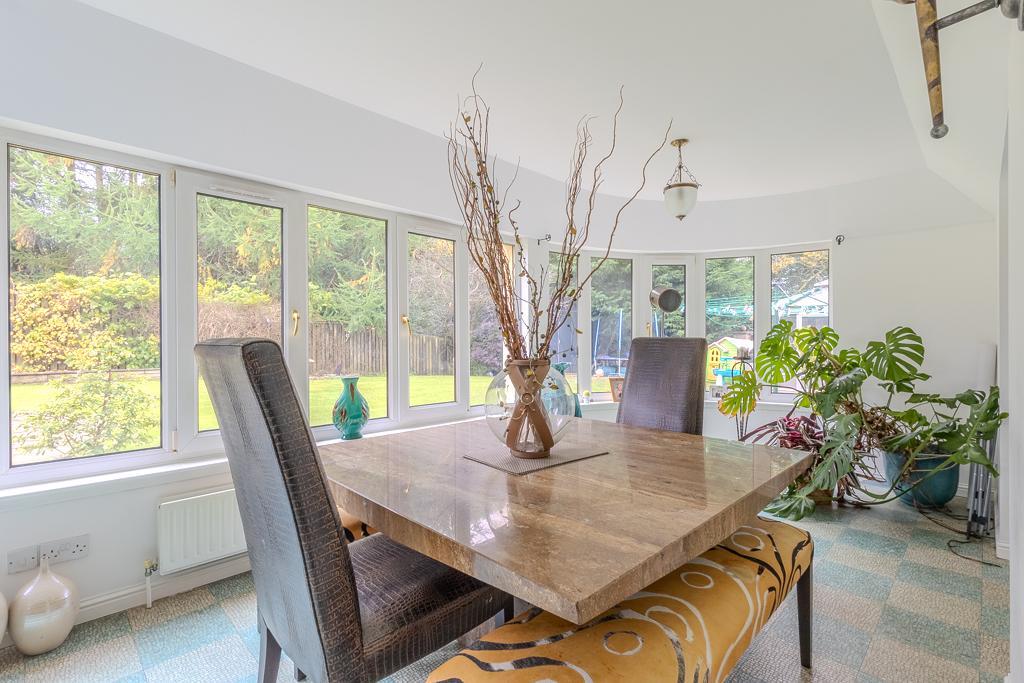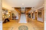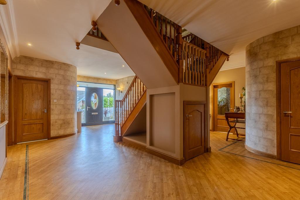 The property is entered via a grand and welcoming reception hallway with a striking central staircase, setting the tone for the impressive accommodation that follows. To the front, a bright and spacious formal lounge provides an elegant setting for relaxation and entertaining, enhanced by a stunning circular turret feature. A separate family room offers a more informal living space, while the generously sized dining room is ideal for hosting guests and family gatherings.