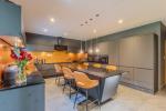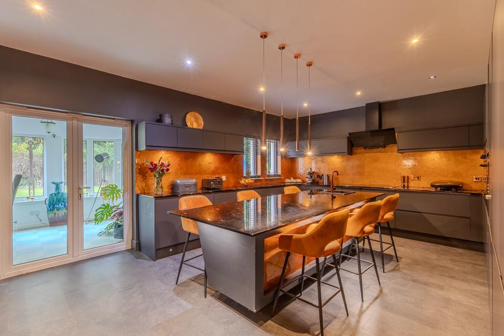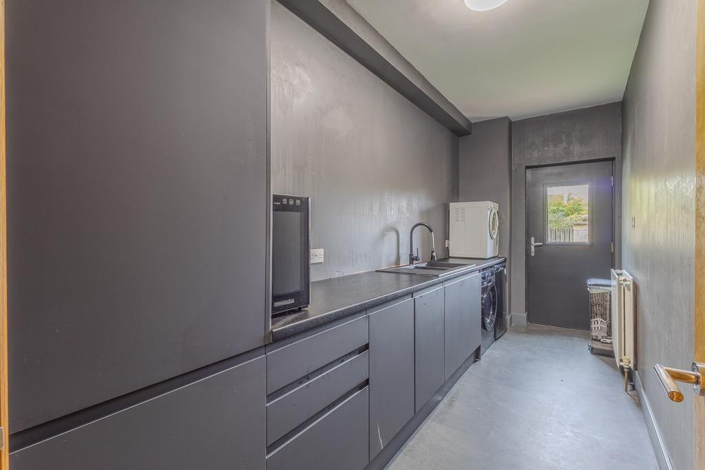 At the heart of the home lies a striking dark contemporary kitchen, beautifully appointed with a comprehensive range of fitted units, high-quality integrated appliances, and ample preparation space. The adjoining utility room provides additional practicality. A truly remarkable feature of this home is the expansive rear sun lounge, seamlessly connecting the kitchen, family room, and games room to create an open, light-filled living area with direct access to the garden, ideal for modern family life and entertaining.