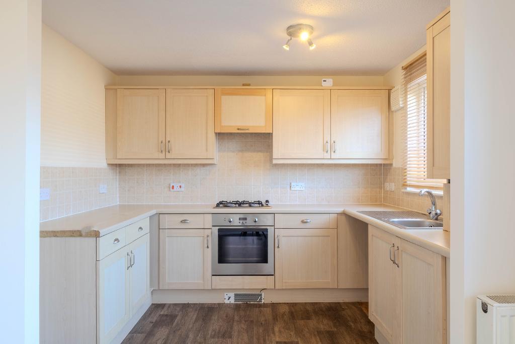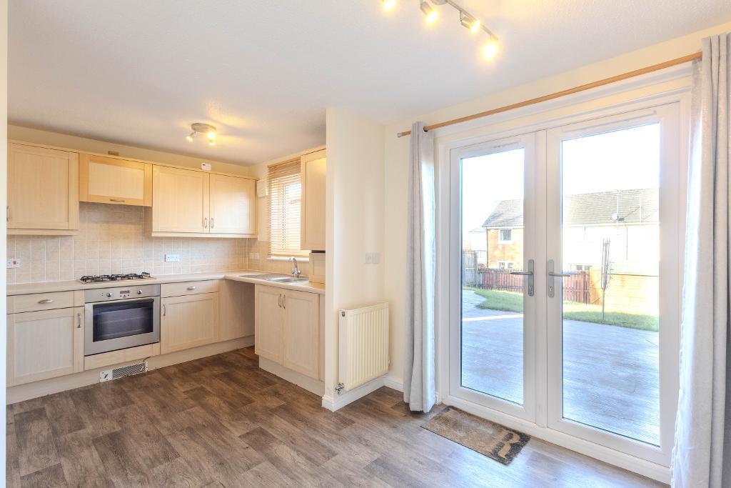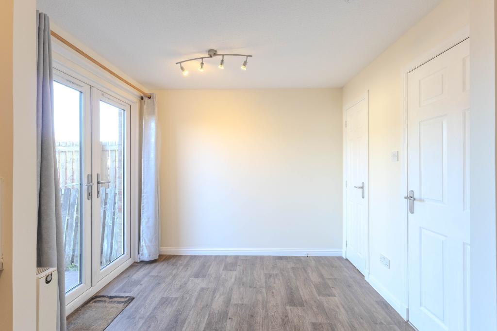 Internally, the property opens into an entrance vestibule, with a convenient WC located just off it, leading through to a bright and spacious lounge, an inviting space ideal for both relaxation and entertaining. To the rear, the kitchen is fitted with a range of beech-effect wall and base units, complemented by contrasting worktops and integrated appliances, including an oven, hob, extractor hood and washing machine. There is ample space for dining, with French doors providing direct access to the rear garden and enhancing the sense of light and space.