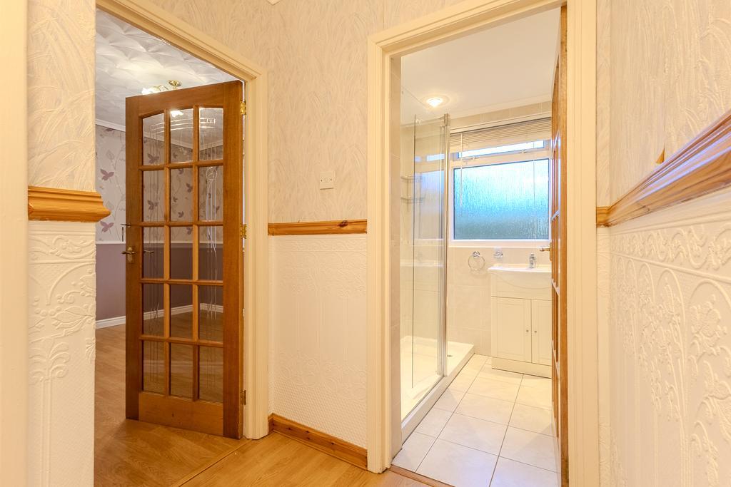 There are two well-proportioned bedrooms, both attractively presented, with one benefiting from a generous built-in storage cupboard. Completing the accommodation is a stylish, fully fitted shower room with a contemporary three-piece suite, finished to a high standard. Additional storage is provided by a large cupboard located off the hallway.