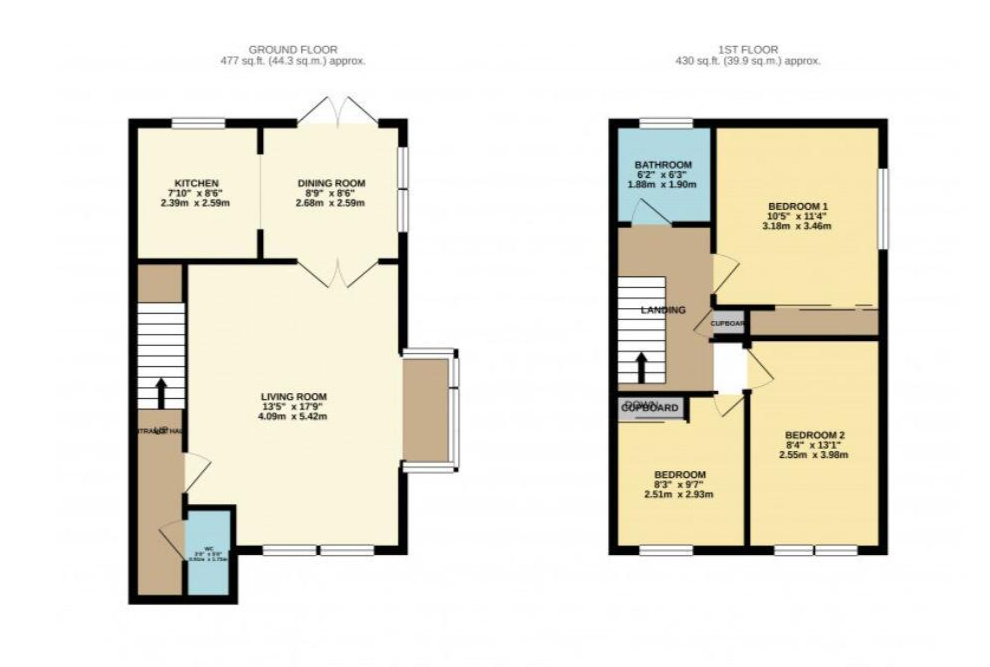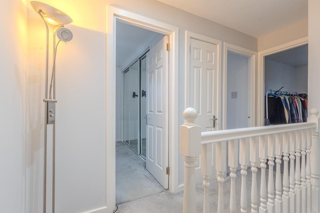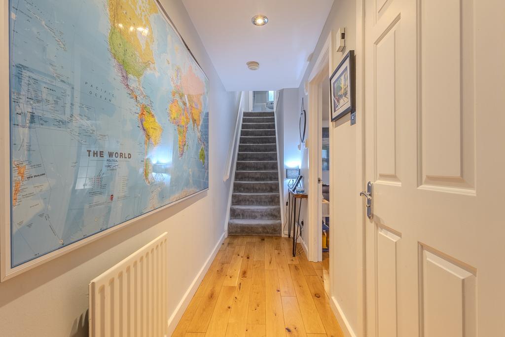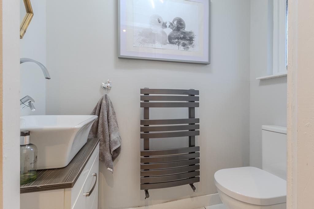 On the first floor, there are two generously proportioned bedrooms, both attractively presented, with the principal bedroom benefiting from built-in storage. The third bedroom is a good-sized double, currently utilised as a dressing room. A modern family bathroom, fitted with a three-piece suite including a bath with overhead shower, completes the accommodation.