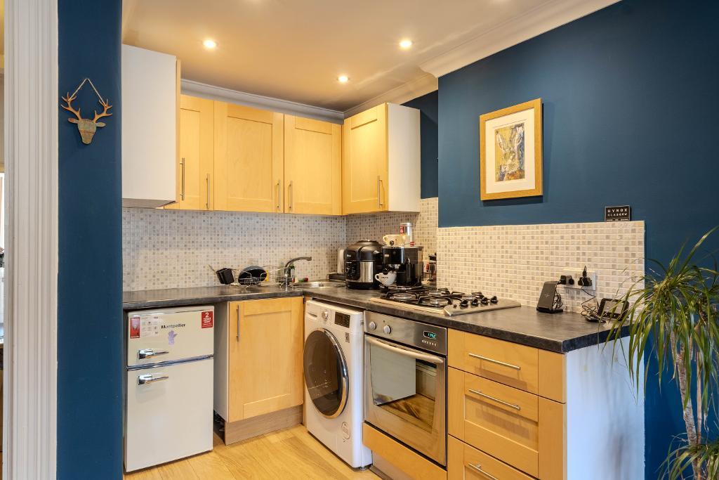 The lounge is a particularly attractive space, enhanced by a striking bay window which floods the room with natural light. The apartment retains fine traditional features, including ornate cornicing, adding to its overall charm. The lounge flows seamlessly into an open-plan kitchen area, fitted with a range of wall and base units and incorporating an oven and gas hob, creating a sociable and functional living environment.